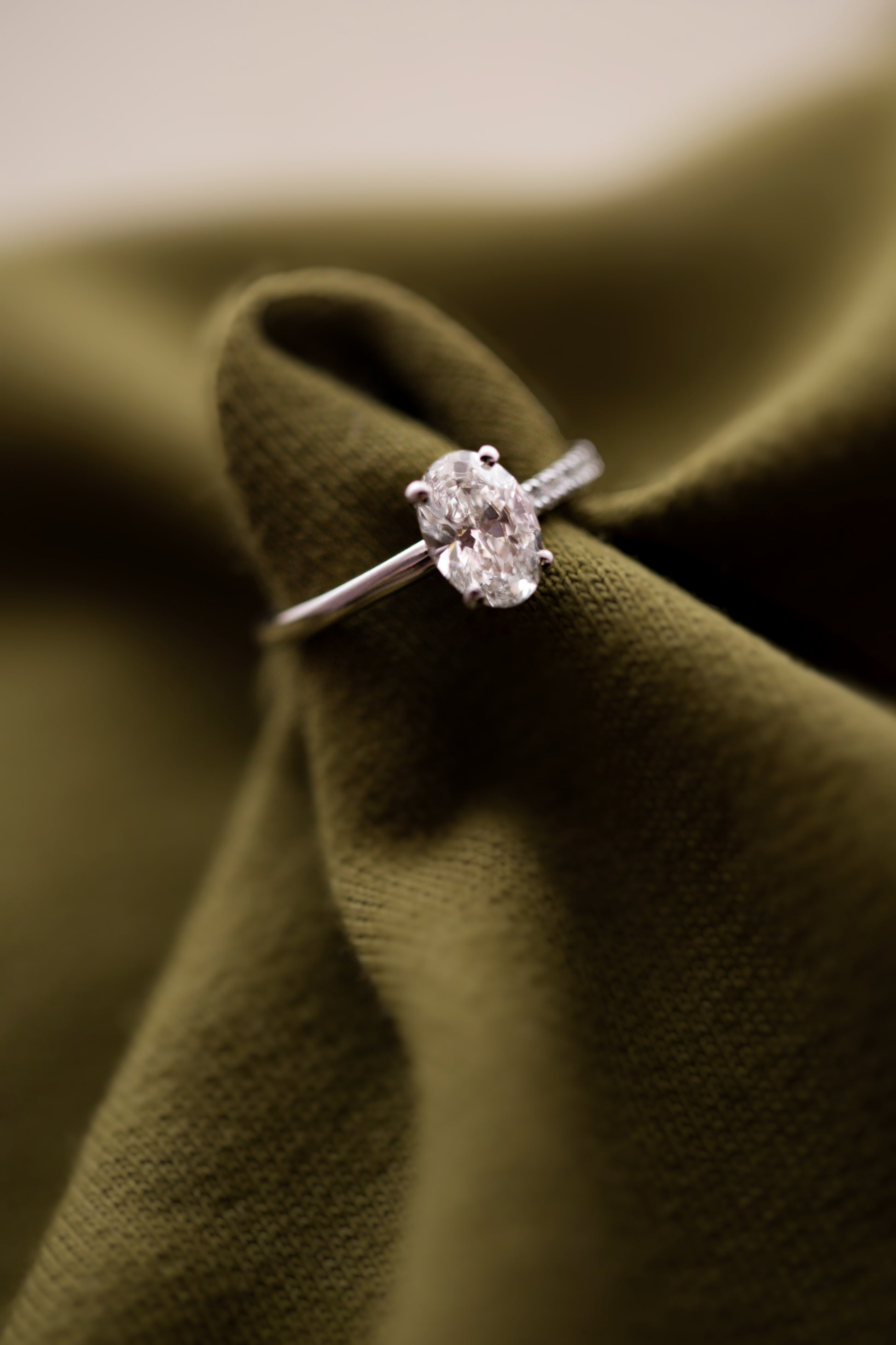 Deze ovale diamant wordt aangevuld met 10 witte lab grown diamanten 1,1 mm.