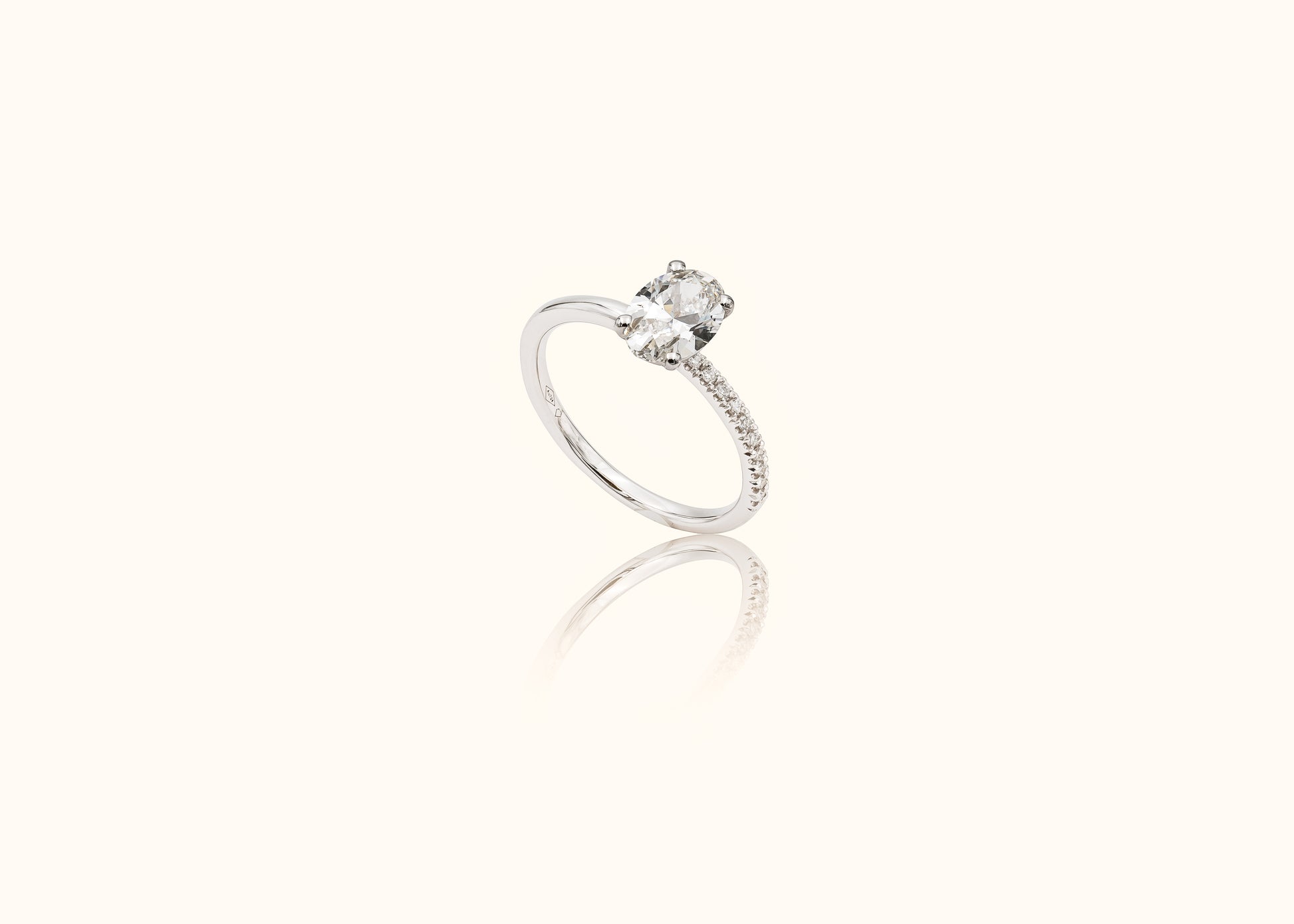 Babette is een ring die de perfecte balans vindt tussen romantiek en karakter. De ovale diamant straalt een zachte elegantie uit, terwijl de speelse zijkant van diamantjes de ring een gedurfde en moderne twist geeft. Voor wie niet bang is om te kiezen voor iets anders, maar toch de tijdloze schoonheid van een diamant wil behouden.