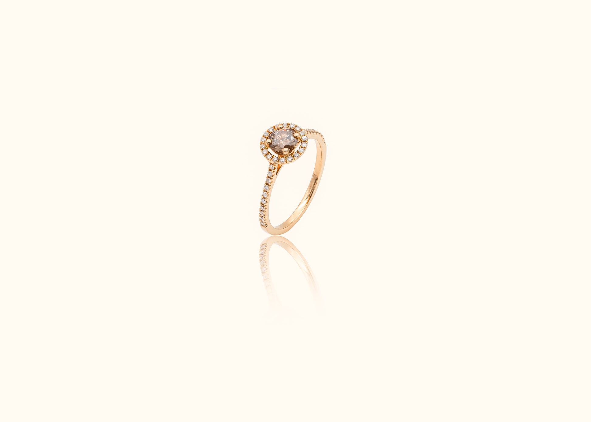 Evelyn is een romantische ring die je doet wegdromen. De warme, cognackleurige natuurlijke diamant in het hart van de ring wordt omringd door witte natuurlijke diamanten, die samen een verfijnde en tijdloze uitstraling creëren. De rose gouden band met subtiele diamantjes maakt dit stuk tot een ware ode aan de liefde, vol elegantie en charme. Een ring die elke liefde weerspiegelt in haar mooiste vorm.