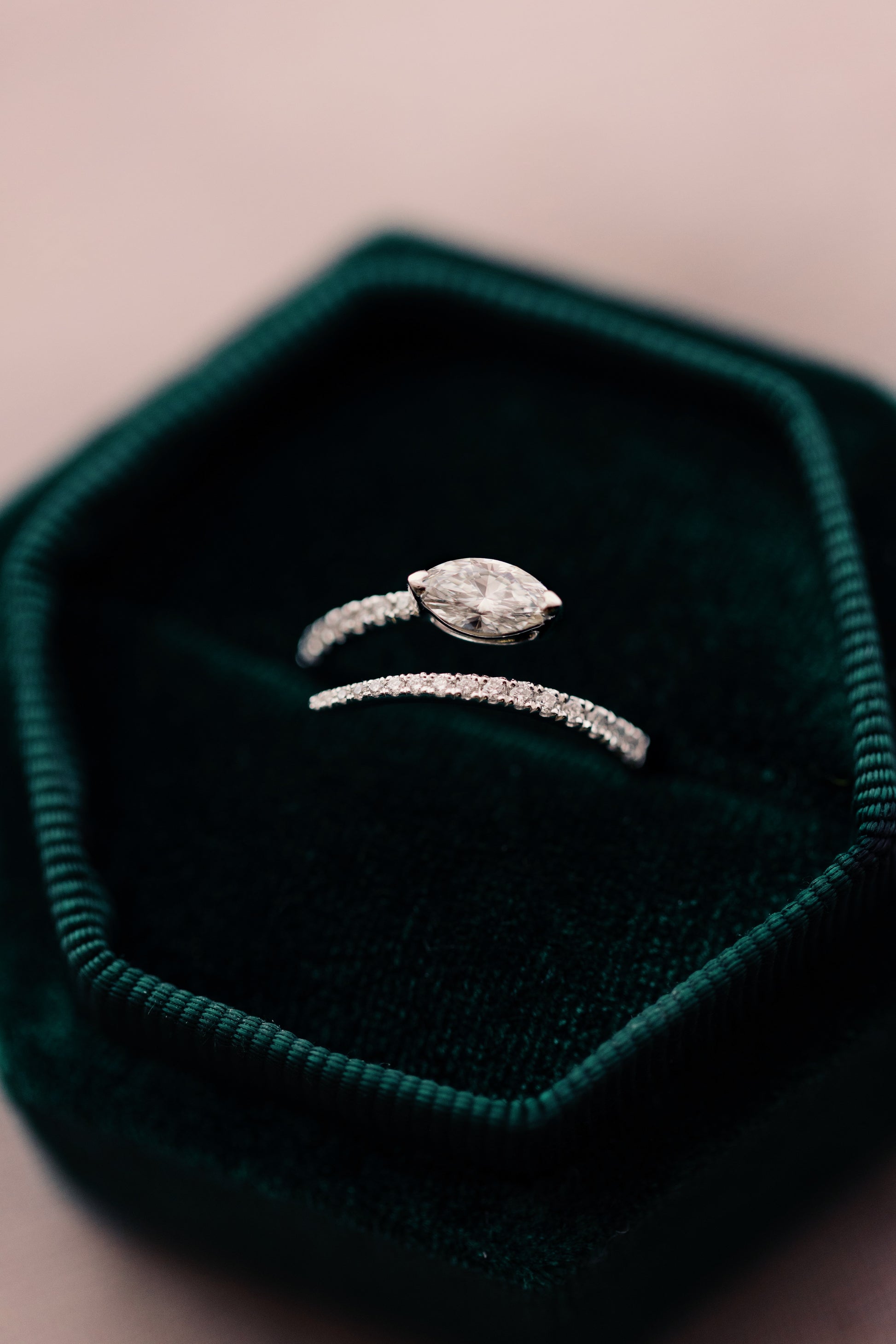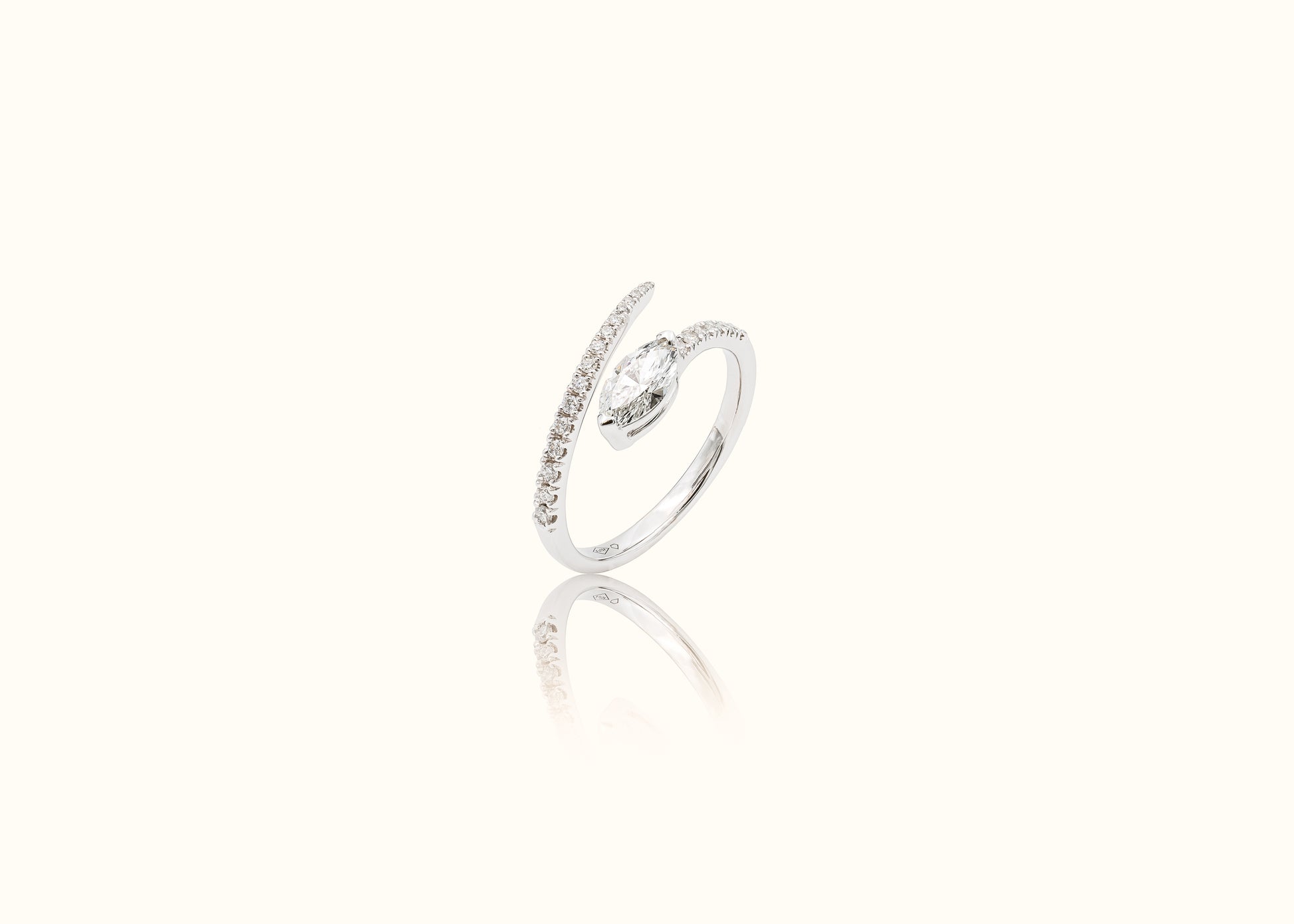 Florence is een ring die zich met kracht en dynamiek om je vinger slingert. De markiesdiamant, met zijn scherpe, speelse vorm, gecombineerd met de unieke slangenvormige setting, maakt dit juweel tot een gedurfde keuze.