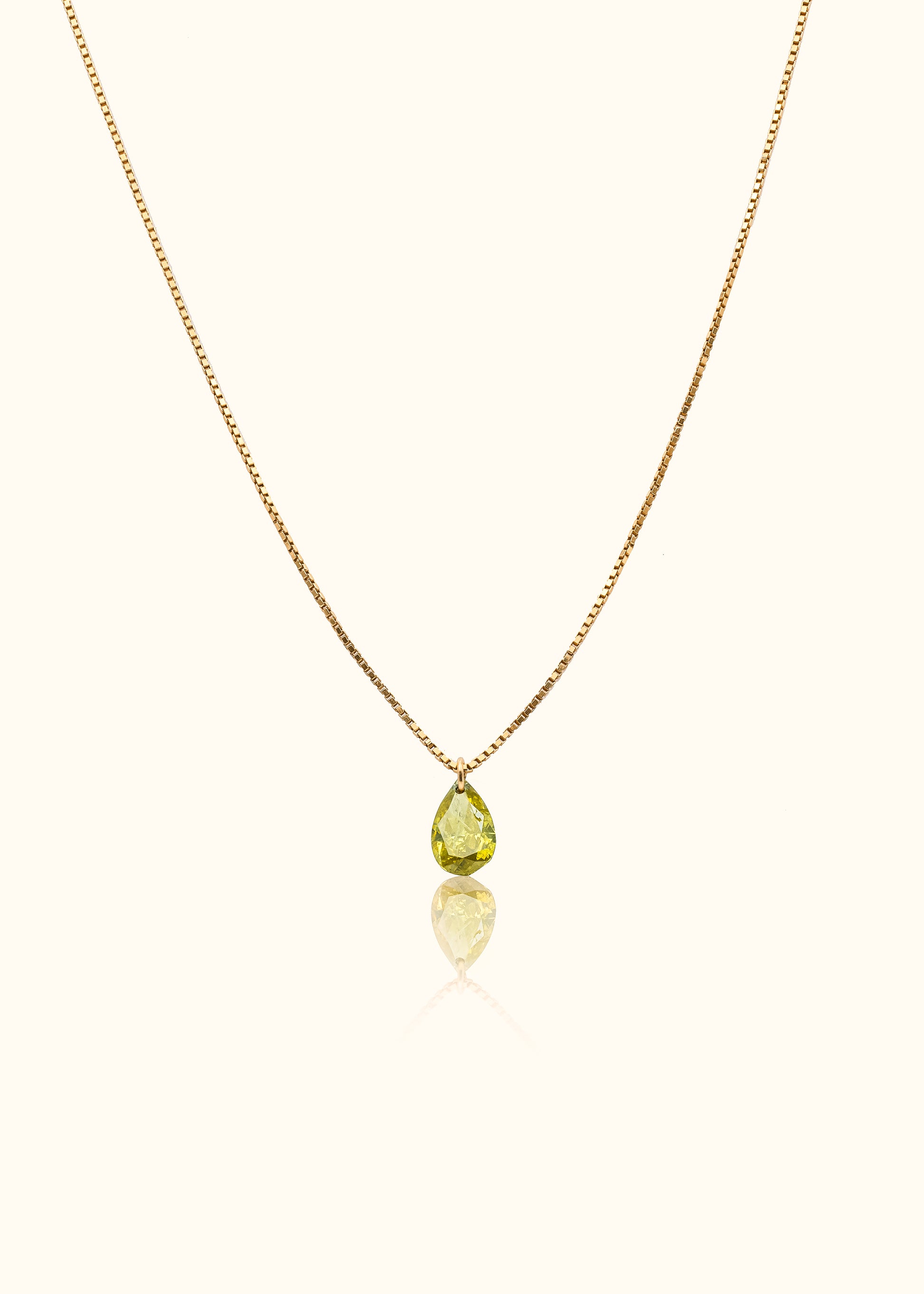 Deze ketting bevat een natuurlijke geelgekleurde peervormige diamant van 0,8 karaat, en is mogelijk met elke diamant. Deze ketting is 40 cm lang.