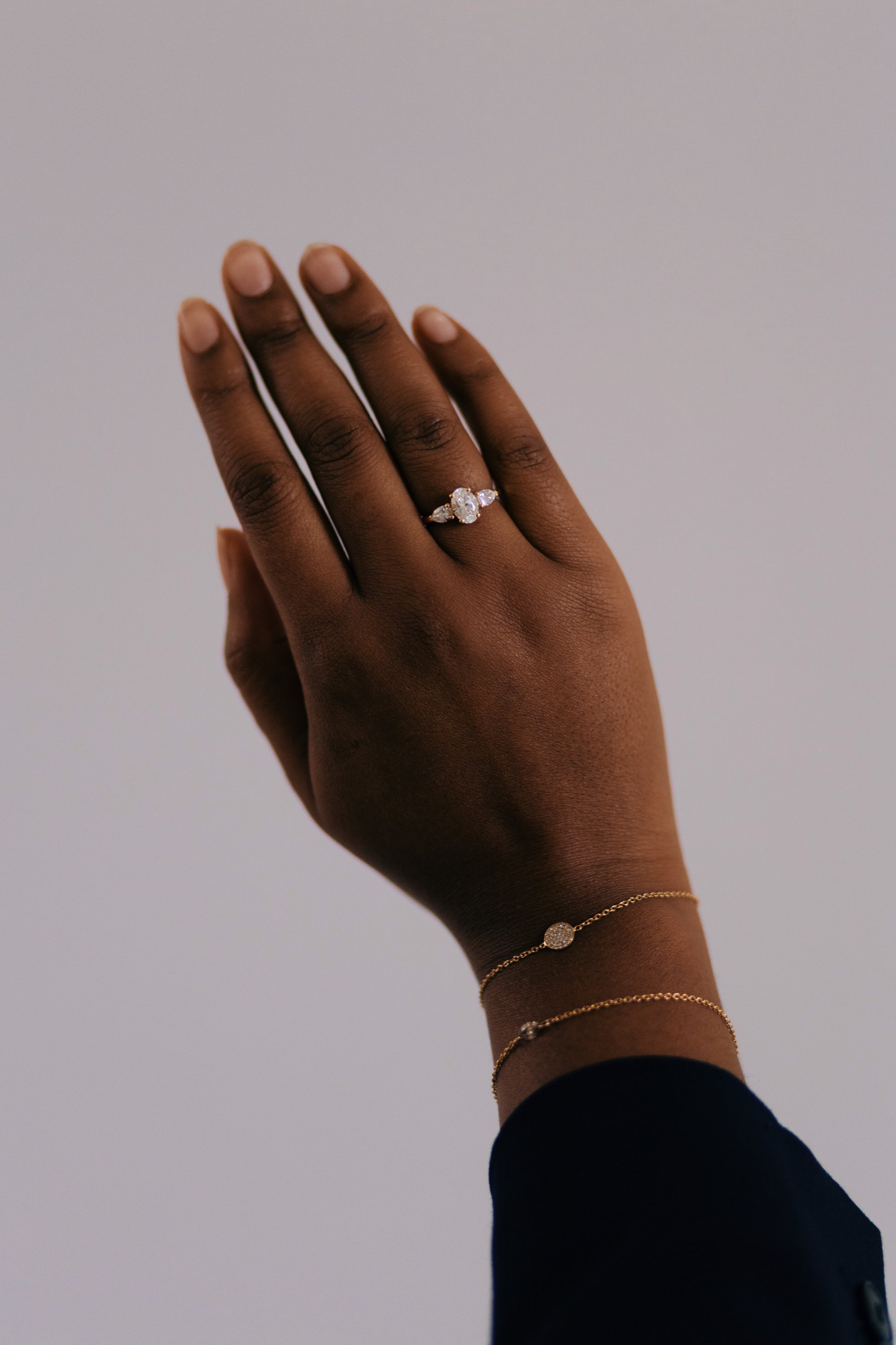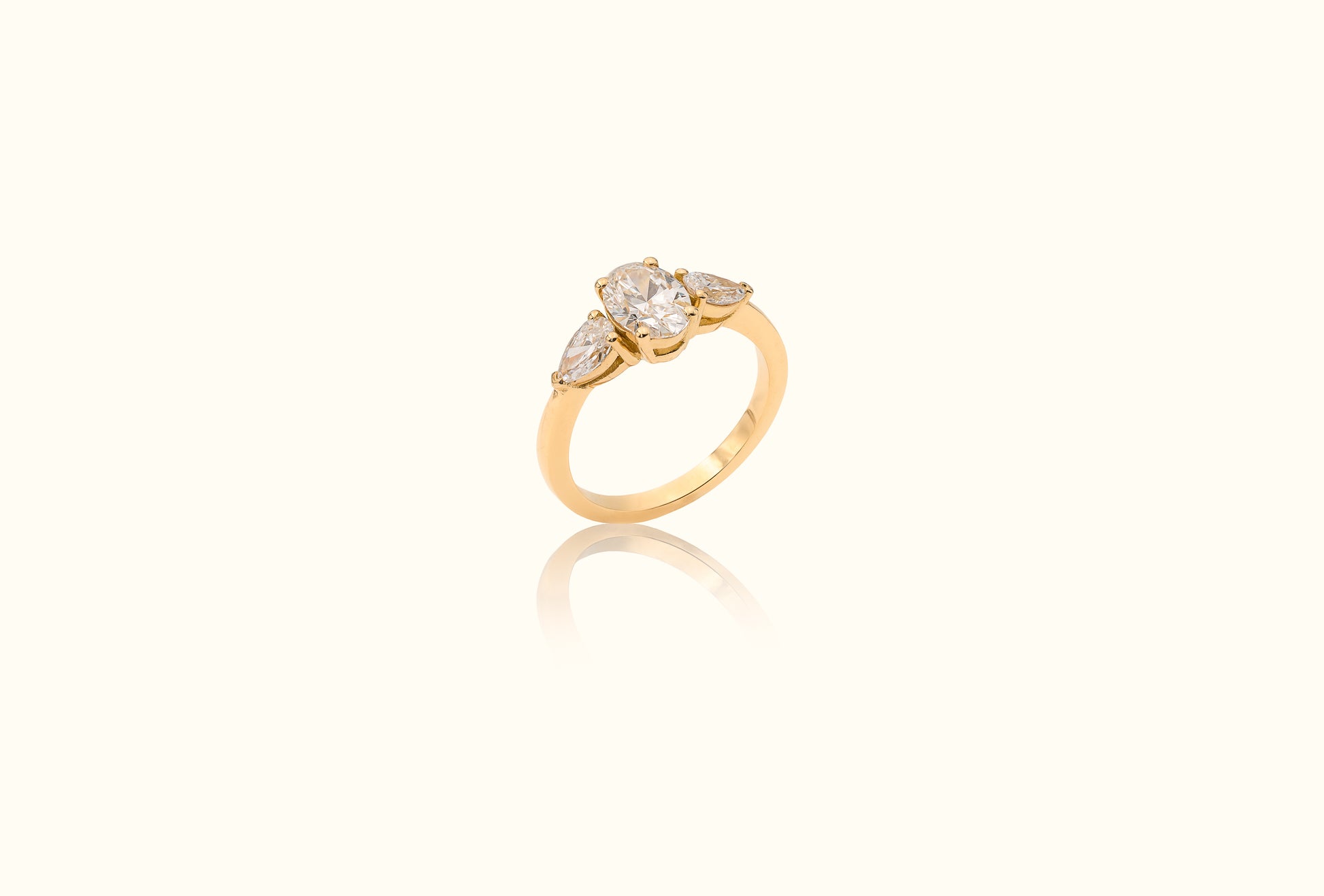 Details ring: 18 karaat geel goud, centersteen is ovaal van 1,05 karaat D, VVS2 lab grown met peervormige zijdiamanten van 0,4 karaat per diamant, ringmaat 53