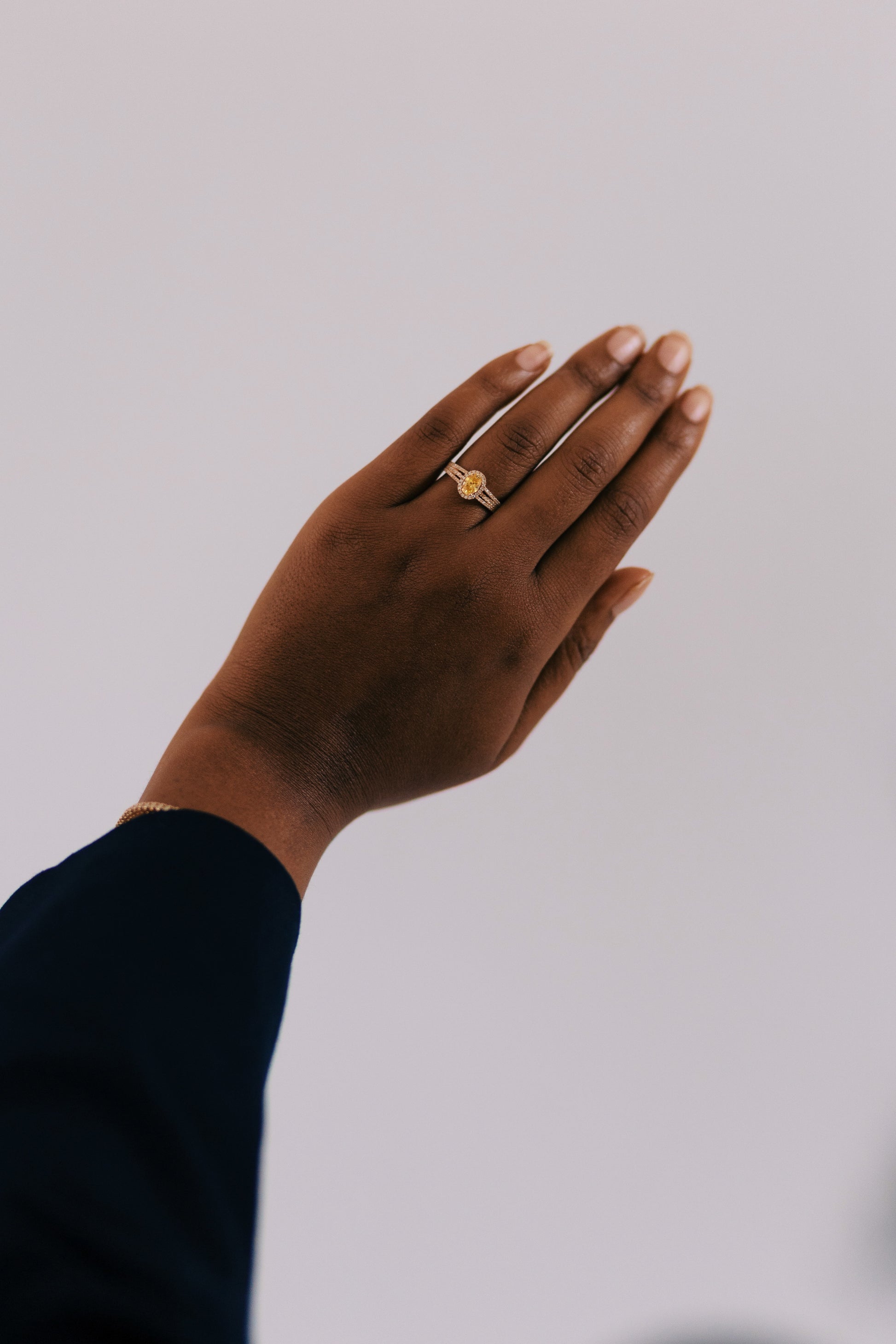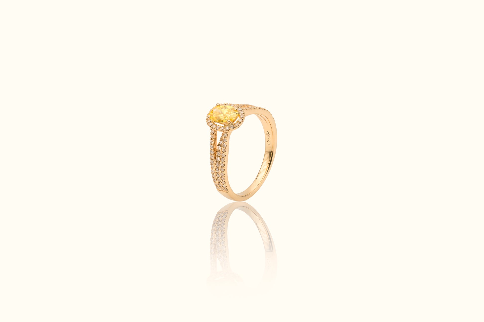 Léonie is voor zij die straalt met subtiliteit met deze zachte sunshine statement aan haar vinger. Een ovale, gele lab-grown diamant van 0,5 karaat, omringd door een halo van licht. De drie verfijnde banden symboliseren warmte, kracht en vrouwelijkheid.