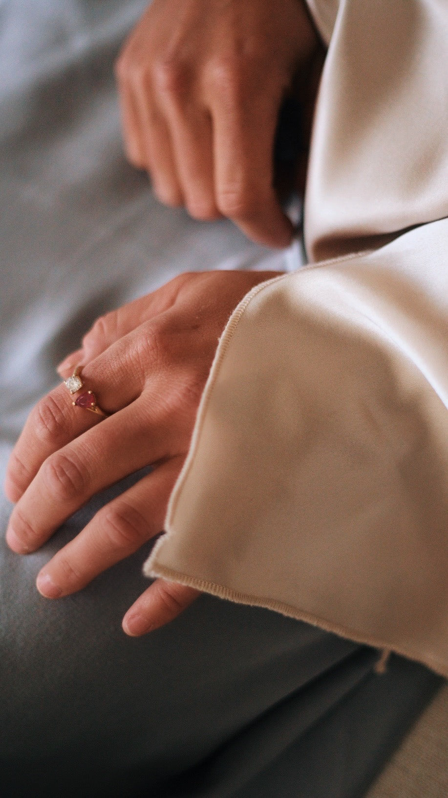 De ring is ontworpen met een 0,50 karaat cushionvormige lab-grown diamant en een 0,79 karaat peervormige robijn.