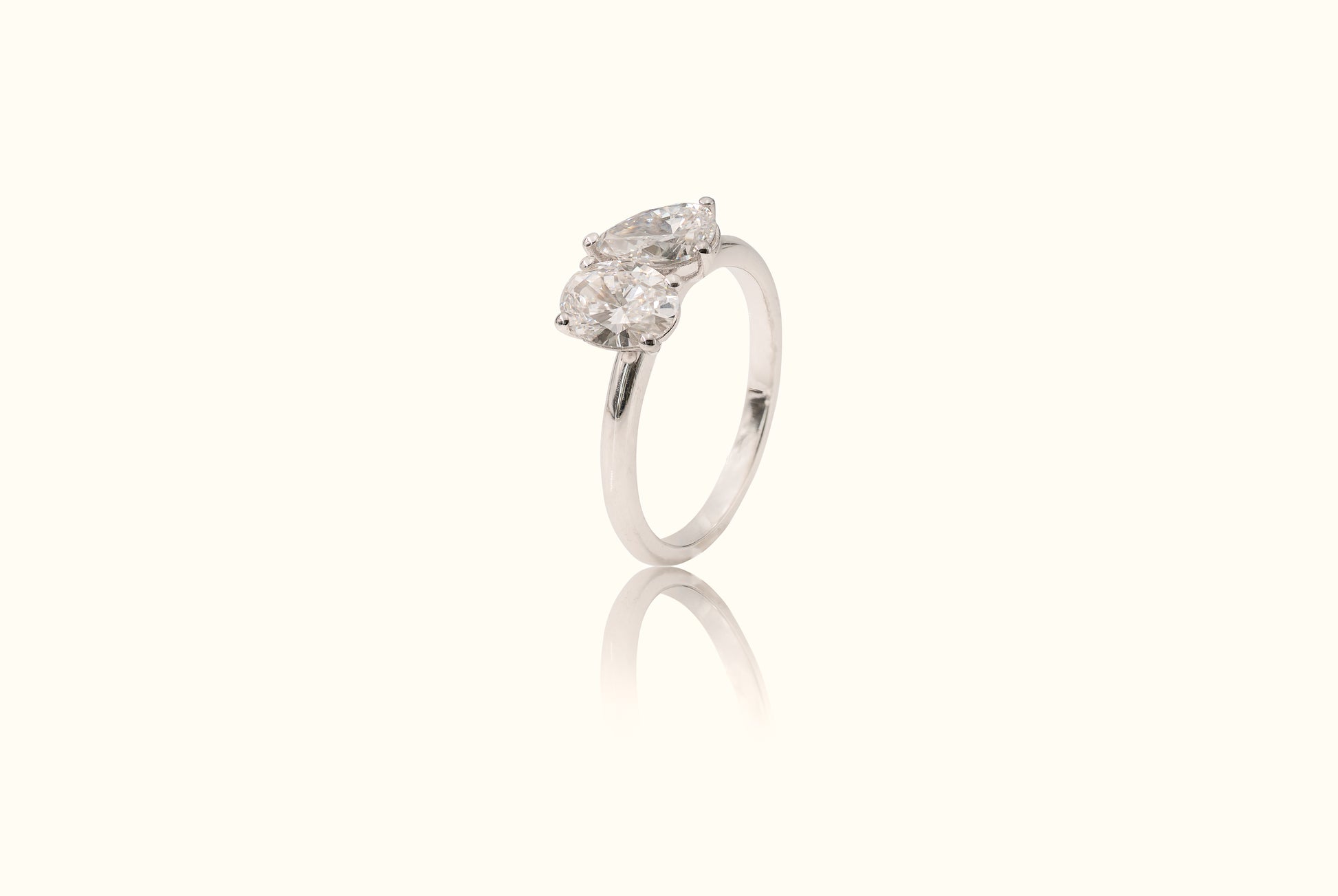 De ovale en peervormige diamant houden elkaar in balans, symbool voor twee zielen die elkaar aanvullen.