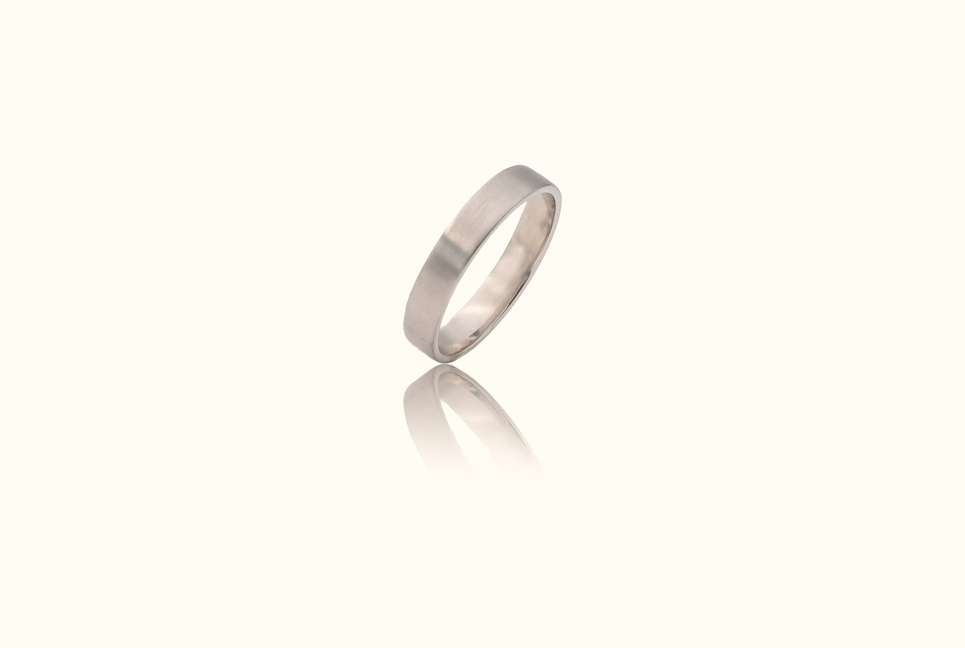Michael is een 4 mm brede ring in mat wit goud, een subtiel statement van eenvoud en kracht.